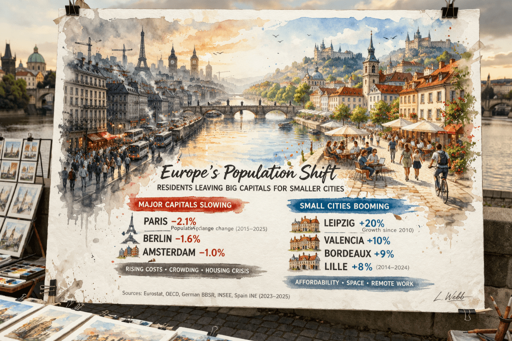 A quiet but measurable population shift is underway across Europe, as smaller cities and regional hubs begin attracting residents away from long-dominant urban capitals.